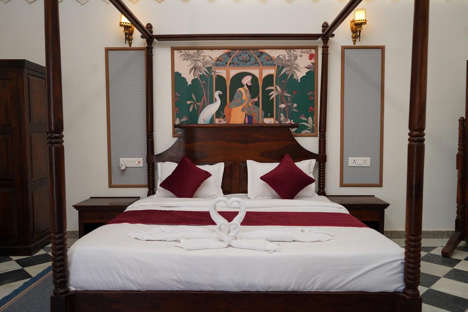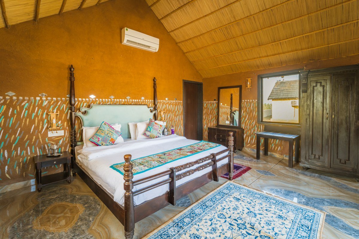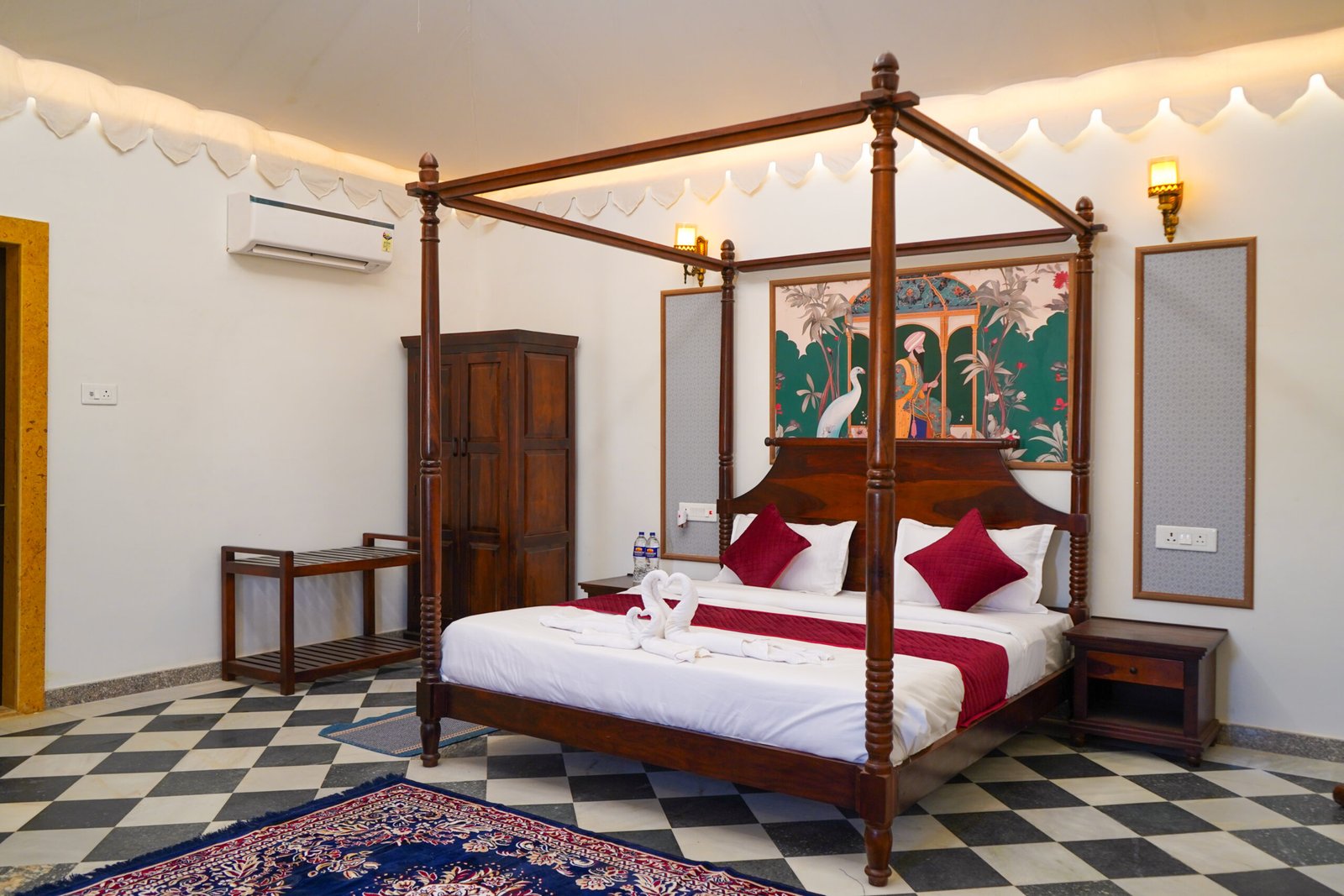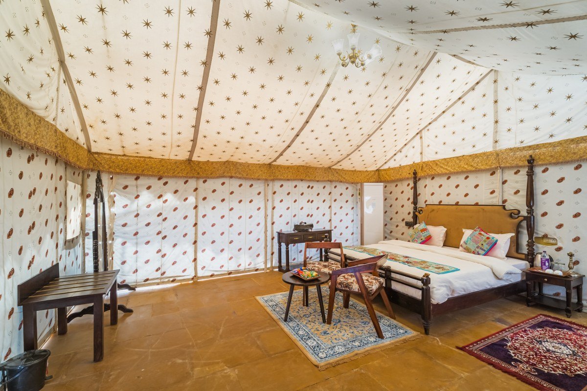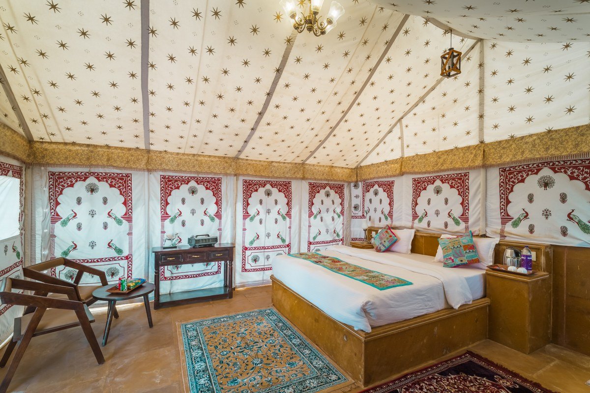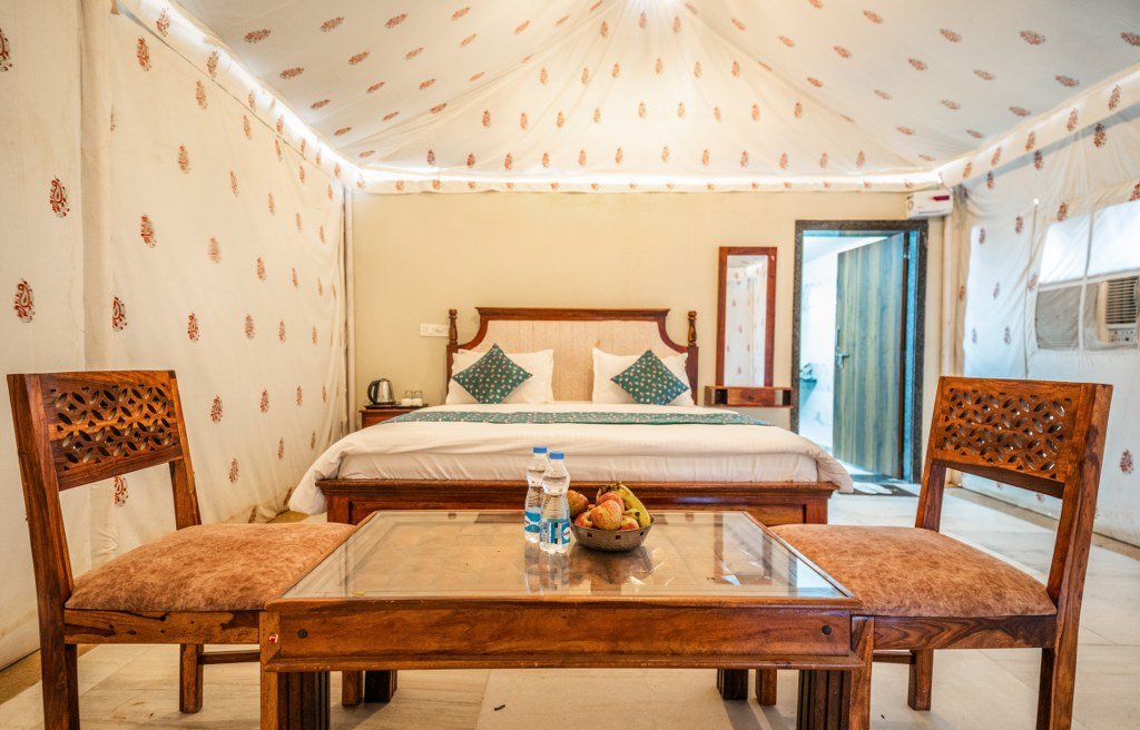 Luxury Swiss Tents: Well-furnished, spacious, and decorated with traditional Rajasthani interiors.